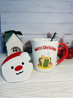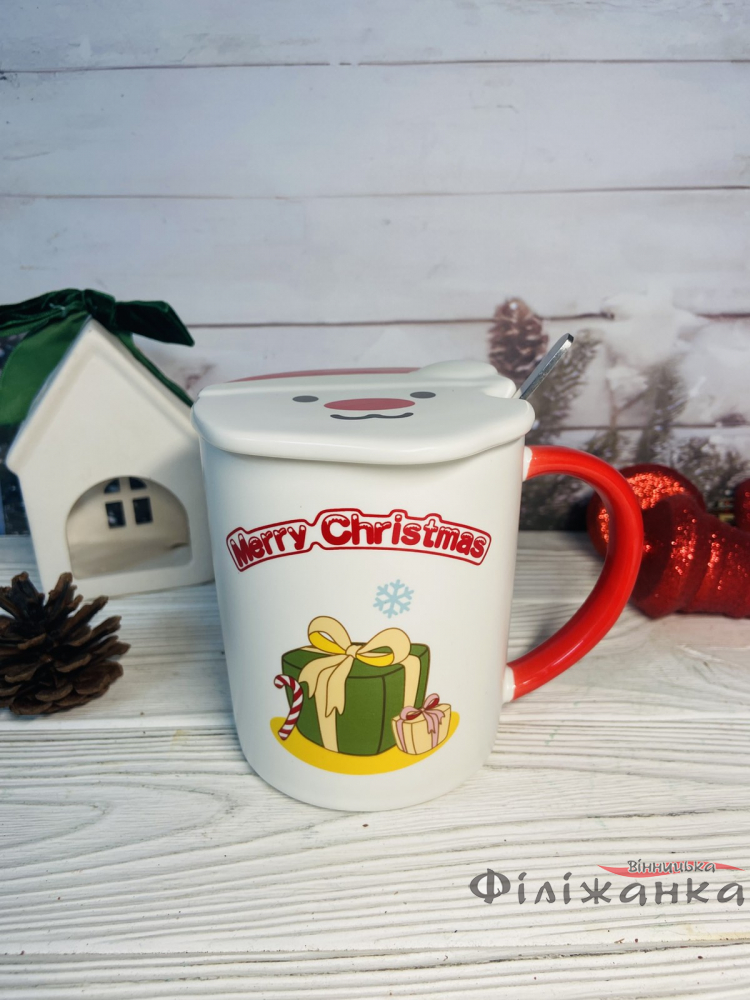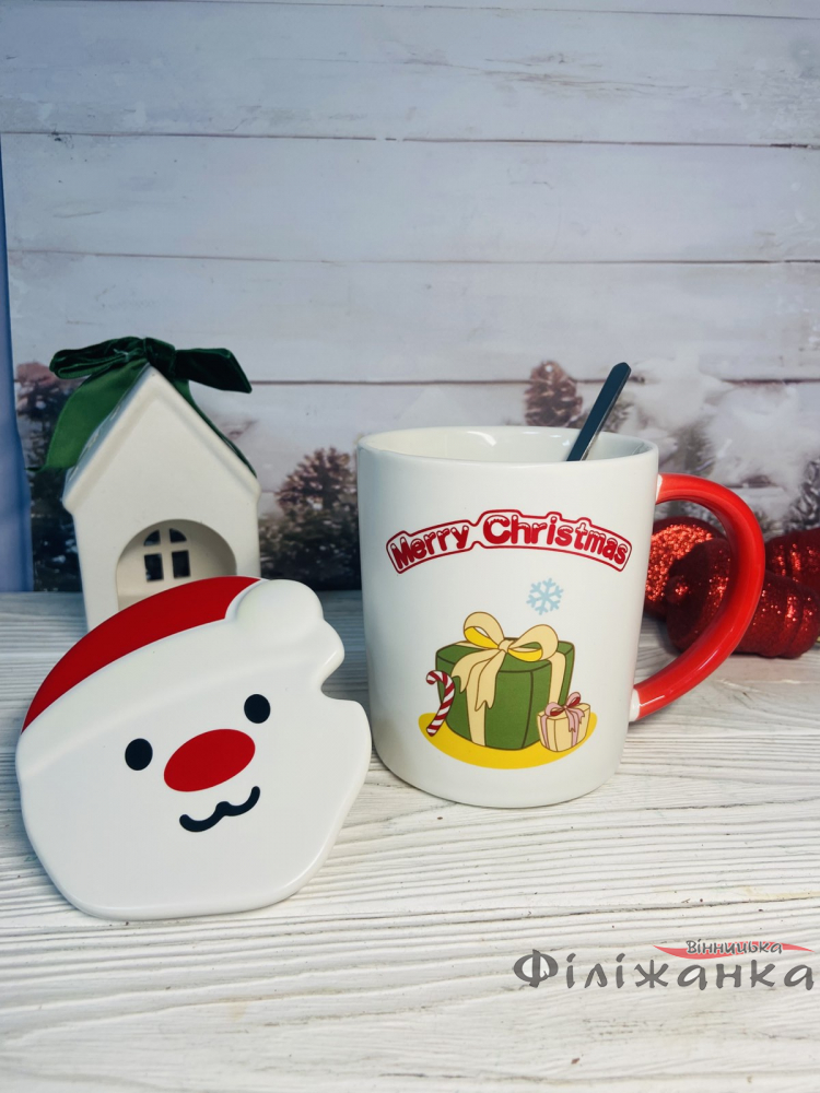 Чашка керамічна з кришкою і ложкою Новорічний подарунок 380мл (60835)