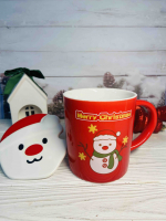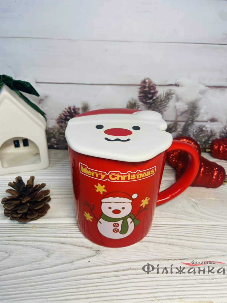 Чашка керамічна з кришкою і ложкою Новорічний сніговик 380 мл (60833)