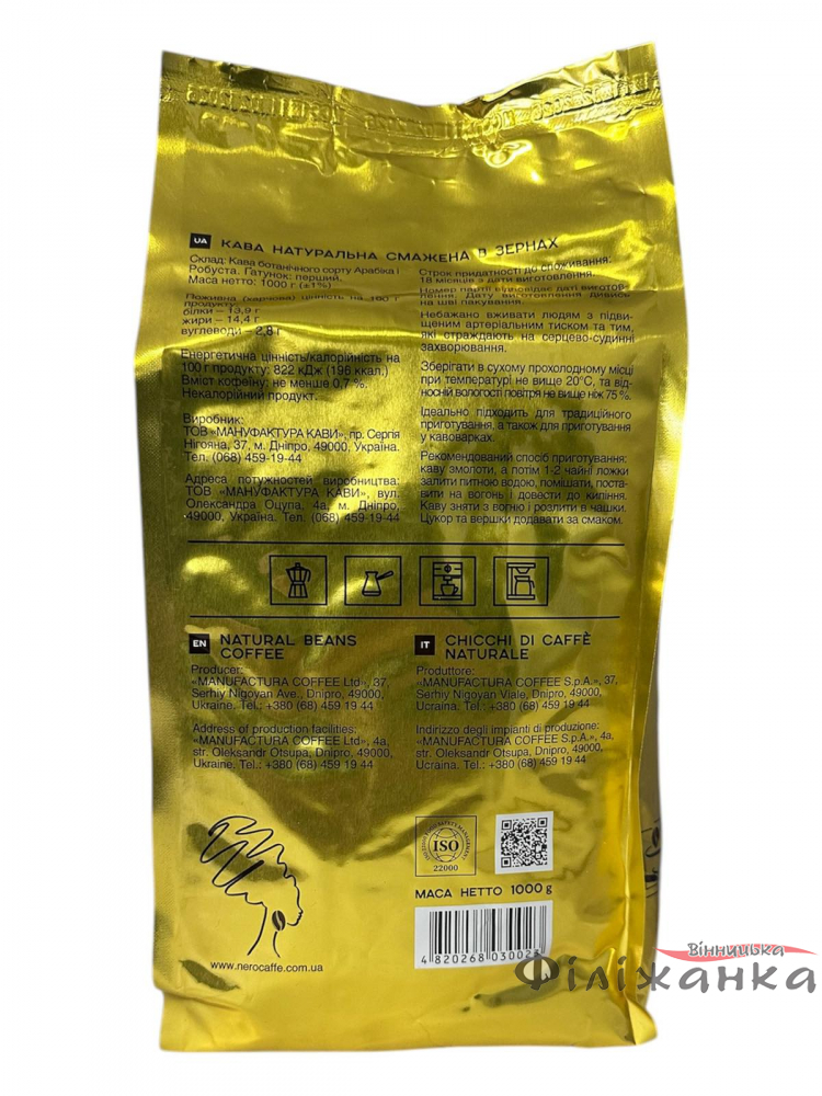 Кава Nero Caffe DOLCE AROMA постачається у вигляді цільних зерен, що є ключовим фактором для збереження максимальної свіжості та інтенсивності аромату. Зерна герметично упаковані у вакуумну упаковку вагою 1 кг, яка надійно захищає їх від впливу повітря, світла та вологи, зберігаючи смакові якості протягом всього терміну зберігання - 18 місяців. Розфасовка продукту здійснюється в Україні з дотриманням всіх європейських стандартів якості, що підтверджує турботу виробника про кожну деталь.