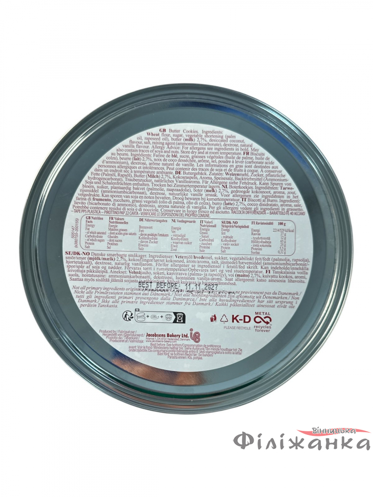 Вироблене та розфасоване у Данії, печиво Jacobsens Bakery гарантує дотримання найвищих стандартів якості. Бляшана банка не лише додає продукту преміального вигляду, а й надійно захищає печиво від зовнішніх впливів, зберігаючи його свіжість, аромат та хрустку текстуру. Це комерційна упаковка, що робить її зручною для зберігання та транспортування.