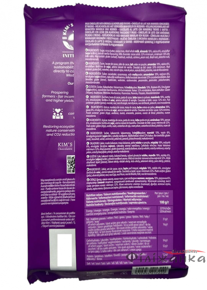 Відчуйте, як кожен шматочок розкриває нові грані задоволення - від ніжності молочного шоколаду до яскравих вкраплень мигдалю та родзинок, створюючи незабутній післясмак.