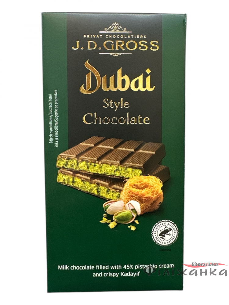 Зануртеся у вир екзотичних смаків з Дубайським шоколадом J.D.Gross Дубай, що втілює східну елегантність та німецьку майстерність. Кожен шматочок – це запрошення до неперевершеної подорожі у світ витончених насолод, де зустрічаються багатство фісташкового крему та неймовірна хрусткість кадаїфу.