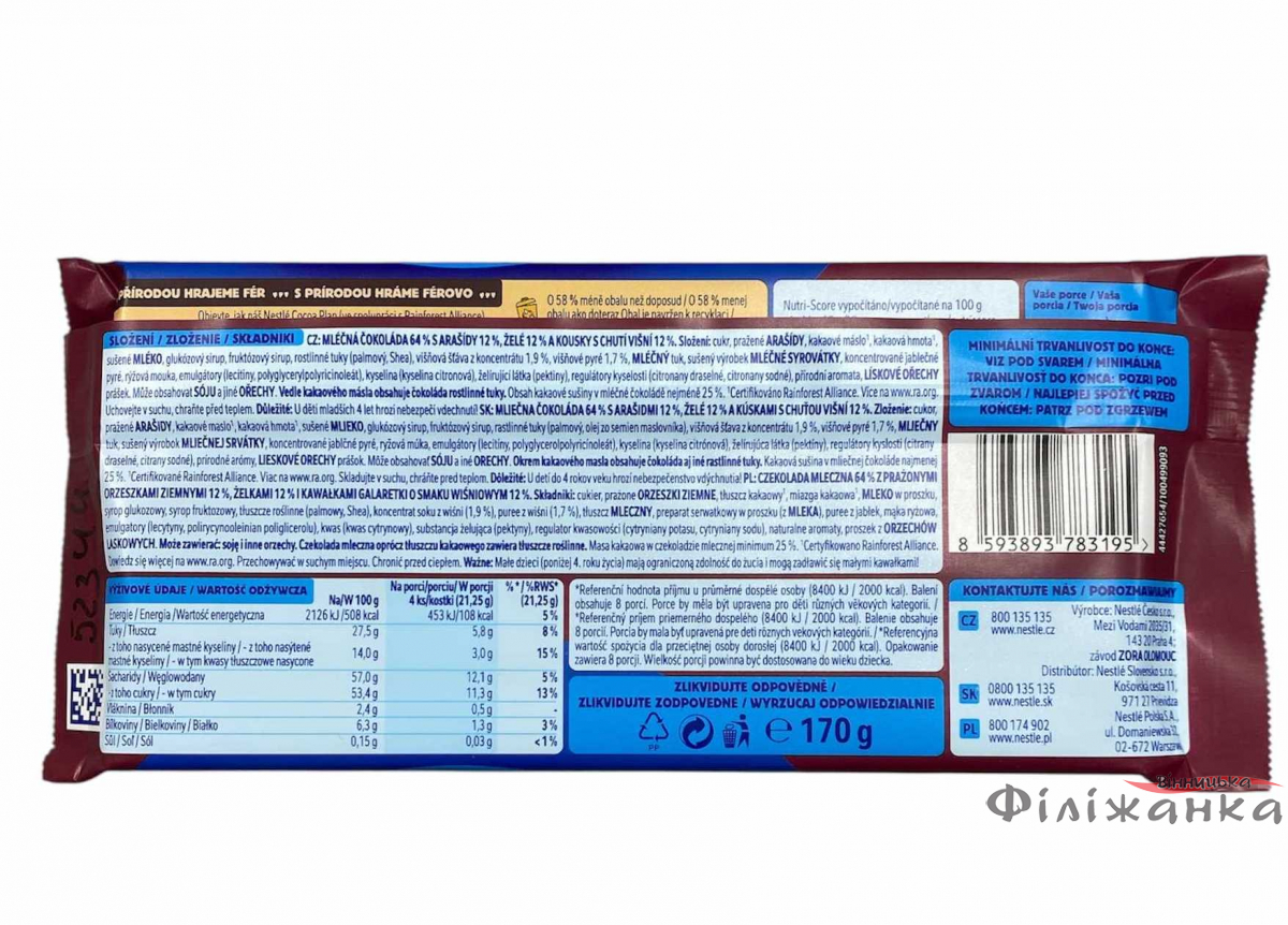 Шоколад Studentska Вишня Молочний з арахісом вишнею і желе 180 г (52344)