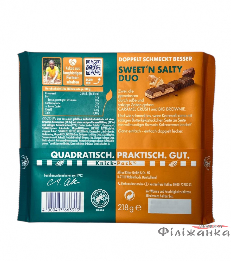 Характеристики Шоколад Ritter Sport Sweet'n Salty Duo молочный Соленая Карамель и Брауни 218 г (60855)