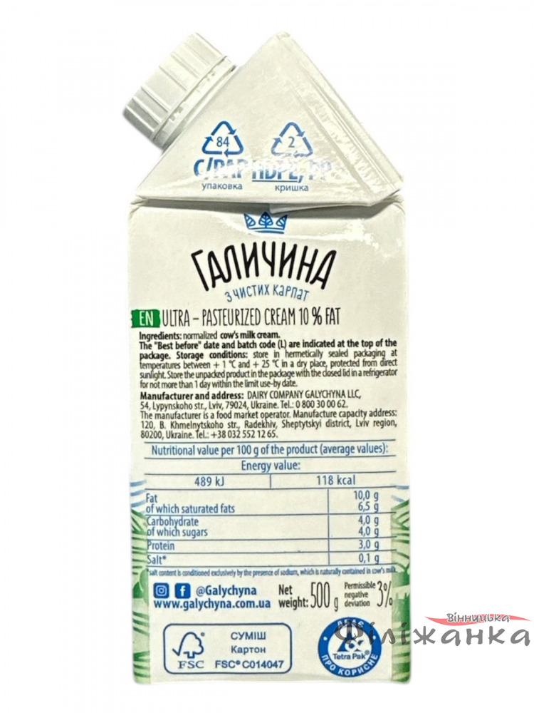 Сливки Галичина ультрапастеризованные 10% 500 мл (52838)